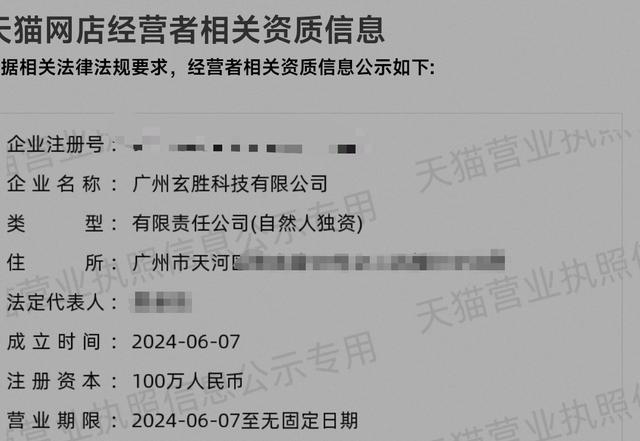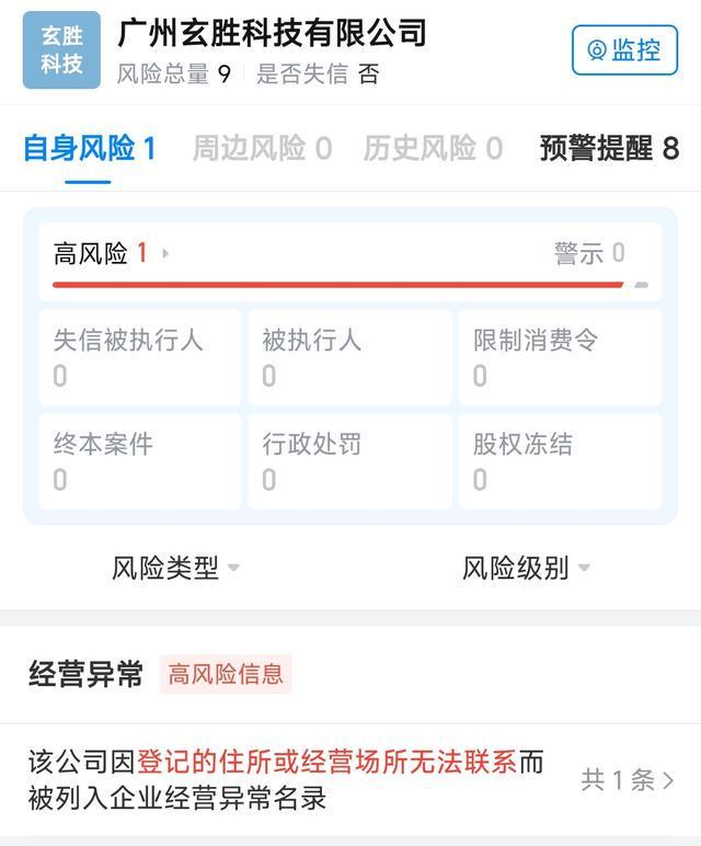 11时许,记者根据该店铺在淘宝天猫上登记的信息查询到,店铺实体为“广州玄胜科技有限公司”,天眼查显示,该公司成立于2024年,是一家以从事软件和信息技术服务业为主的企业。记者拨打其注册时的联系电话,发现电话“已关闭语音通话功能”。广州市天河区市场监督管理局工作人员查询后表示,该企业已在2025年6月18日因失联被列入“经营异常名录”。