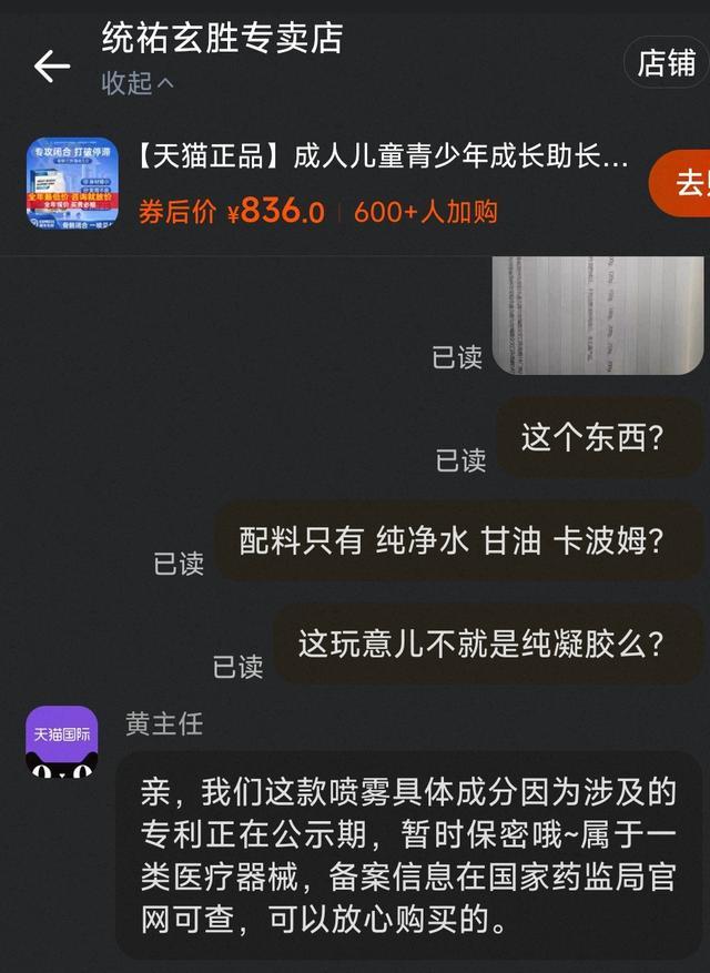 8月26日,记者在淘宝App内搜索涉事店铺“统祐玄胜专卖店”,发现其仍为天猫认证商家,店铺中仅有一款名为“成人儿童青少年成长助长喷雾成长专用神器旗舰店”的产品。该产品被打上“店铺鼻喷剂热销第一名”“超600人加购”等标签,页面显示“近30天8000+人逛过”。